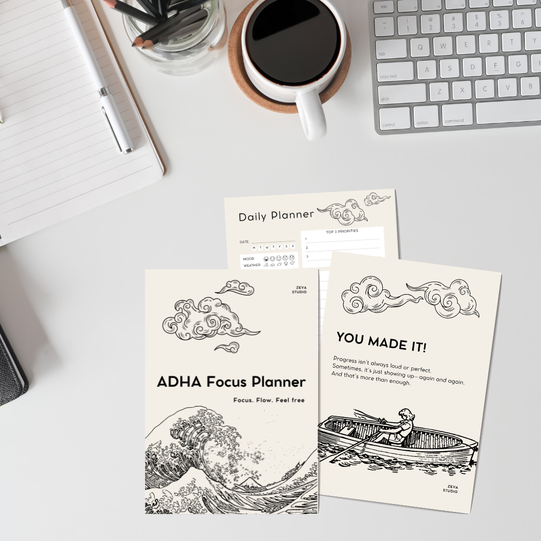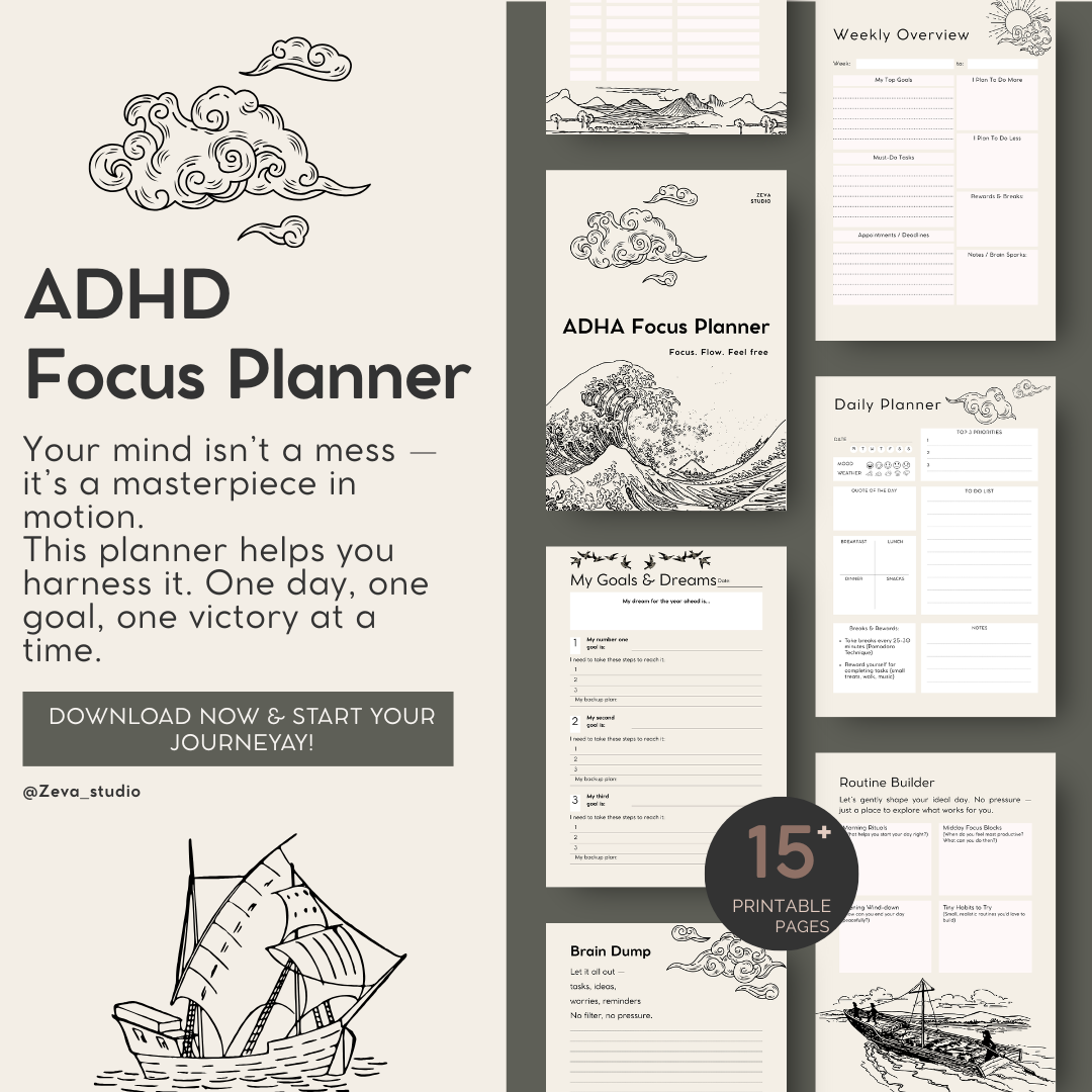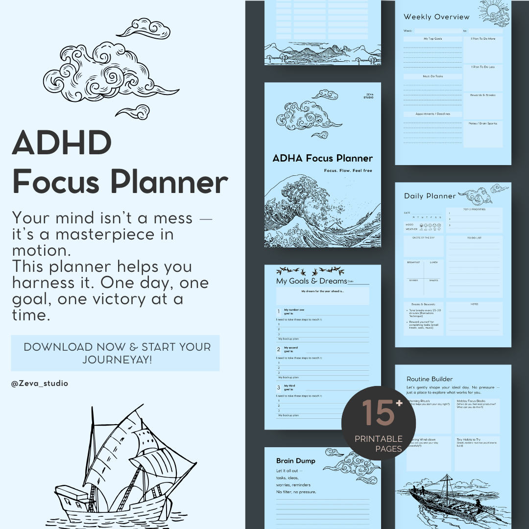 Stay focused and organized with our ADHD Planner, designed for easy printing and digital use. Includes 15 helpful pages in A5 size, available in cream and light blue colors.